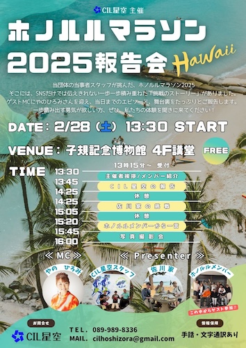 そんな佐川陸くんを含む、星空の仲間のホノルルマラソン報告会があります!