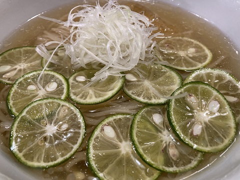 娘と食べた「りょうか」の季節限定スダチ冷やしラーメン。
