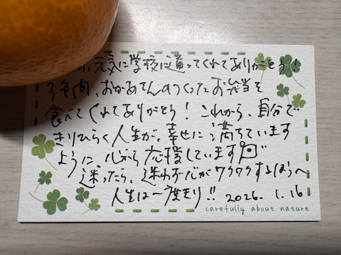「3年間食べてくれてありがとう」と小さなカードをいれておいた。