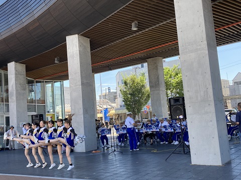 今治市消防団音楽隊の演奏と松山大学のチアのコラボあり。
